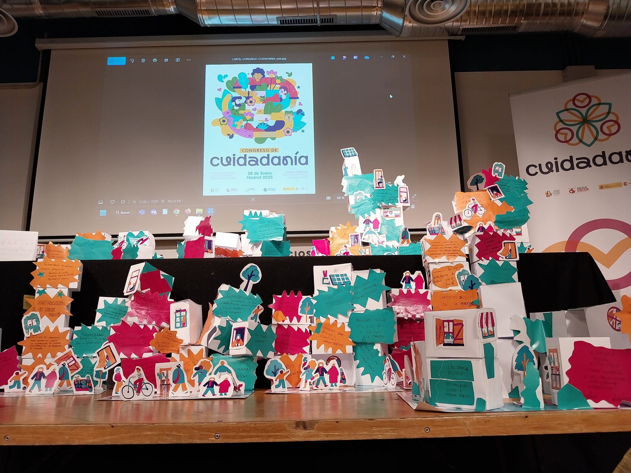 La dinámica del encuentro fue muy participativa: realizamos entre todos/as un taller de creación colectiva de Cuidatopías y tuvimos una feria de iniciativas innovadoras en el que participaron entidades que están desarrollando proyectos en este ámbito.