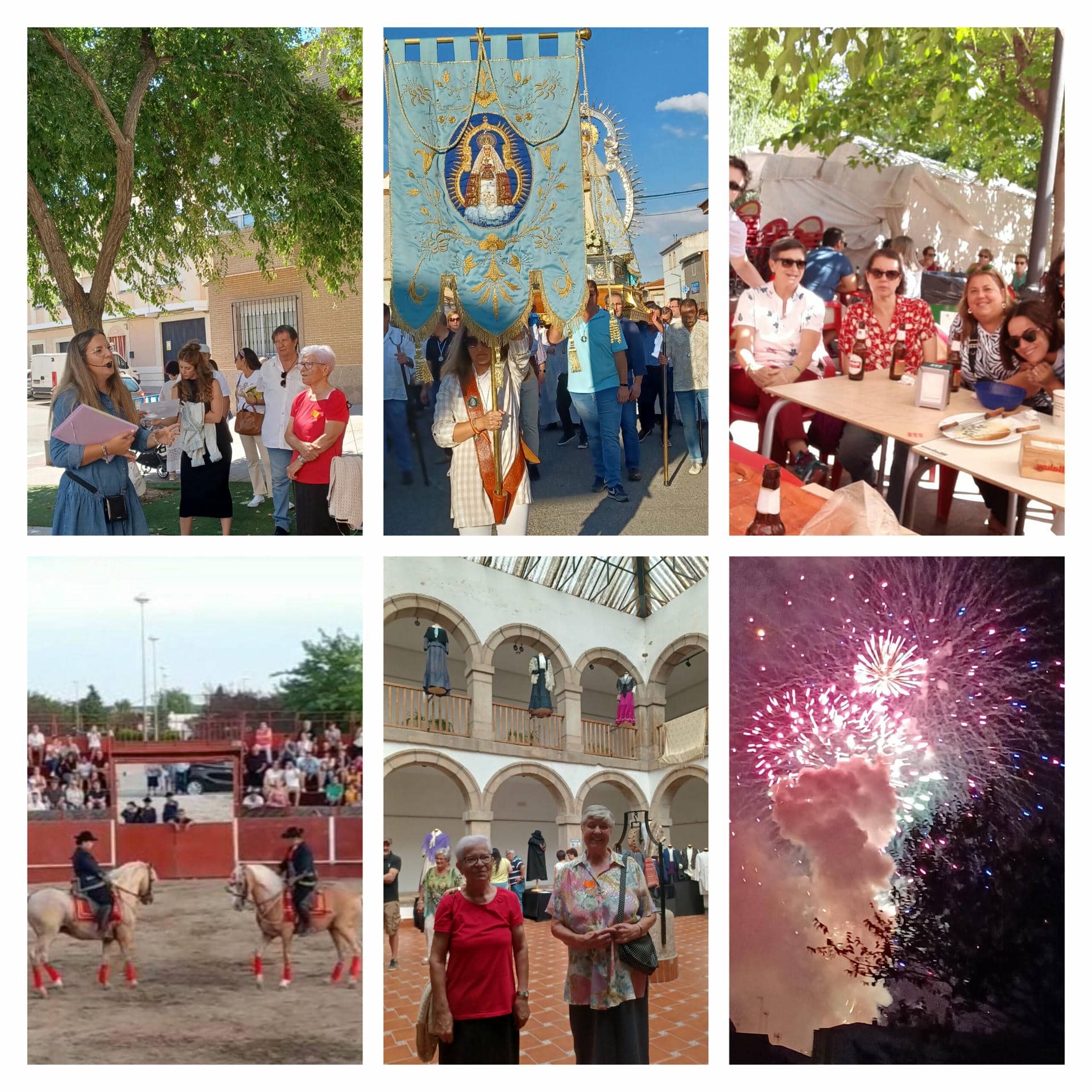 Después de unos días de respiro, el 14, en la noche, la “pólvora” como llaman aquí a un despliegue de fuegos artificiales nos anuncian el principio de una semana de fiestas por todo lo alto. Procesión del Cristo, bailes regionales con grupos de Alicante, Asturias y cómo no manchegos de la tierra. Teatro diario de diferentes compañías, visita teatralizada por el pueblo, diana que bien de mañana recorre las calles del pueblo con su Banda Municipal, vaquillas, espectáculo ecuestre, baile de caballos traídos de Andalucía, concierto… y delicias para degustar y recrear, en los múltiples chiringuitos y puestos, en torno al Ayuntamiento.