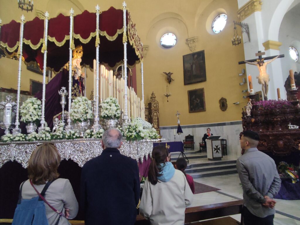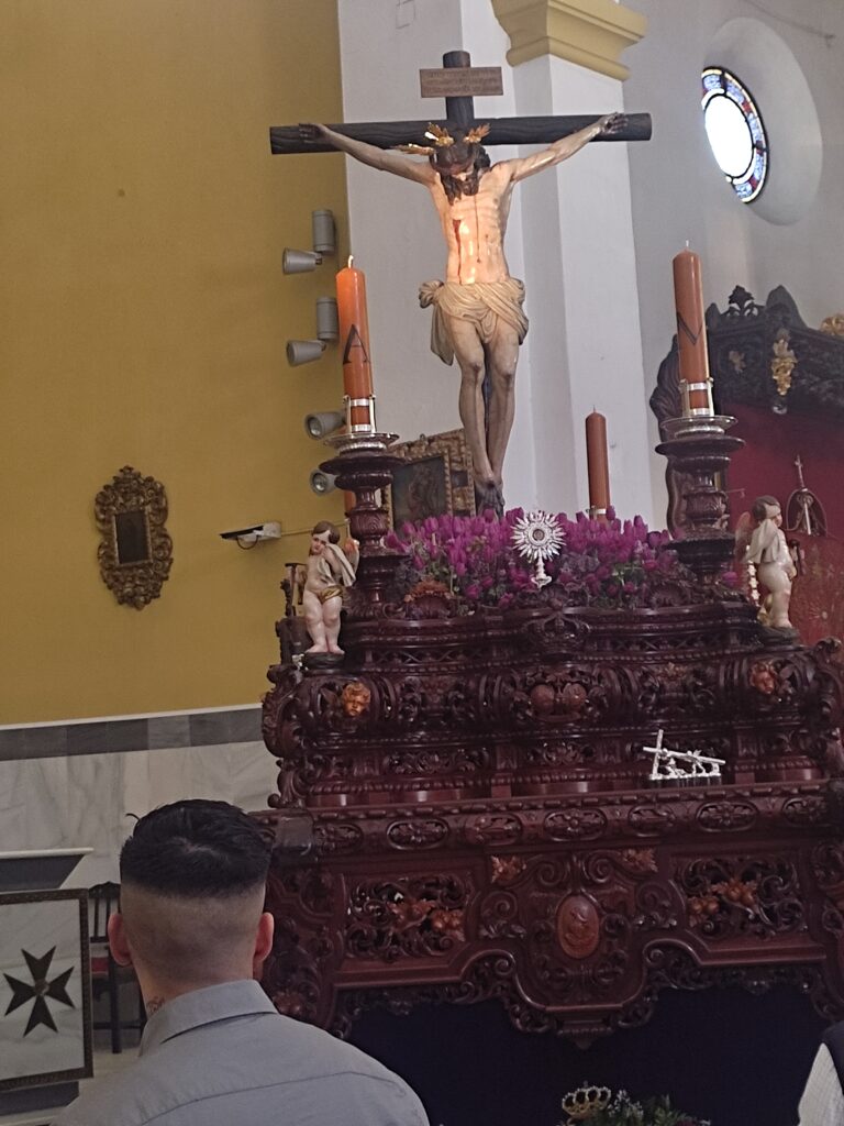 Cada año, el sábado de pasión, día en que sale la procesión por el pueblo, se celebra un acto en el que participamos las hermanas de la comunidad y miembros de la Hermandad. A las 12h del mediodía nos encontramos para el rezo del Ángelus y para colocar la reliquia en el paso mientras se canta Todo por Jesús.