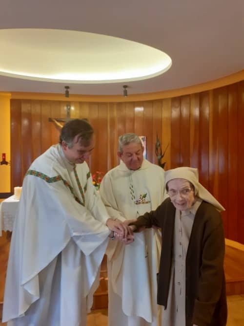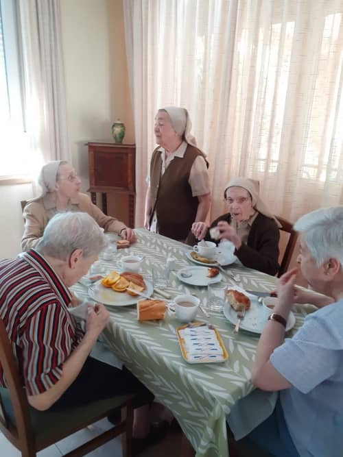 El día 2 de junio celebramos los 100 años de vida de nuestra hermana Mercedes Fernández. Un día muy rico en todos los sentidos: vivencia comunitaria de gozo, alegría y acción de gracias. Desde el desayuno comenzó la fiesta, unidas a nuestras hermanas del Gobierno Provincial que, con canciones asturianas y su ritmo correspondiente, acompañamos – casi en procesión - a Mercedes, hasta la entrada en el comedor.