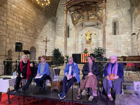 Finalmente, e sempre debaixo de água, o público começou a chegar em número bastante considerável, dadas as circunstâncias. O Ir. Mosén Peio Sánchez moderou o encontro, com a sua habitual boa disposição e o seu humor caraterístico. Aproveitando a visita da Ir. Gema Meroño à comunidade de Nàpols, pedimos-lhe que fizesse parte do grupo de apresentação, e pudemos desfrutar das suas palavras sempre precisas e do seu testemunho de teresiana.