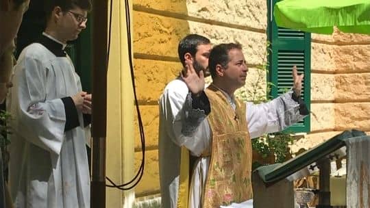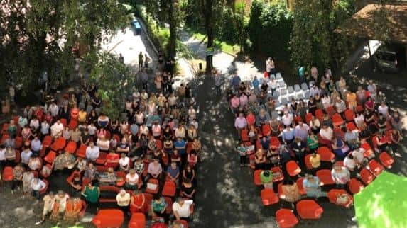 A resposta foi extraordinária: reunimo-nos mais de 300 pessoas. Celebrou a Eucaristia o nosso pároco, que teve palavras fraternamente entranháveis para le suore teresiane, parte viva do bairro, da paróquia. A celebração foi no jardim, na praceta diante da entrada do colégio para que coubéssemos todos.