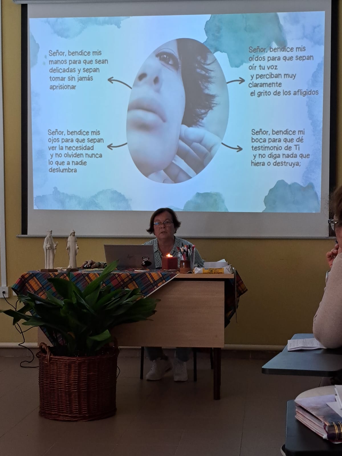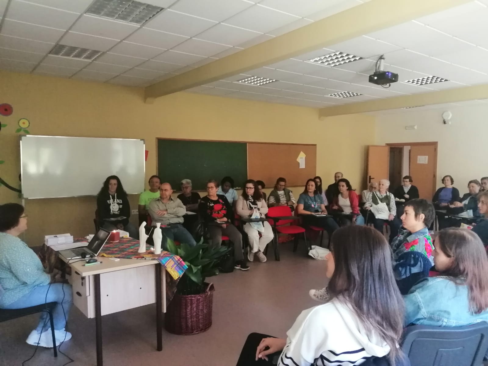 Este encontro teve dois momentos. No primeiro, a irmã orientadora, Fátima Gil, convidou-nos a estarmos atentas e a iniciarmos a nossa caminhada, a olharmos para nós próprias e a vermos de onde partimos neste percurso e qual o roteiro para chegarmos onde gostaríamos de estar no final do percurso. Mostrou-nos como iniciar o nosso projeto de vida, vê-lo como algo simples, um plano pessoal com objectivos e acções para descobrir o nosso “fio de ouro” que Deus preparou para a vida de cada um de nós. Como ver os tropeços como uma bênção disfarçada e falou-nos de três personagens que descobriram e ouviram o chamamento do Senhor: Agar, Jacob, Ruth e Noemi.