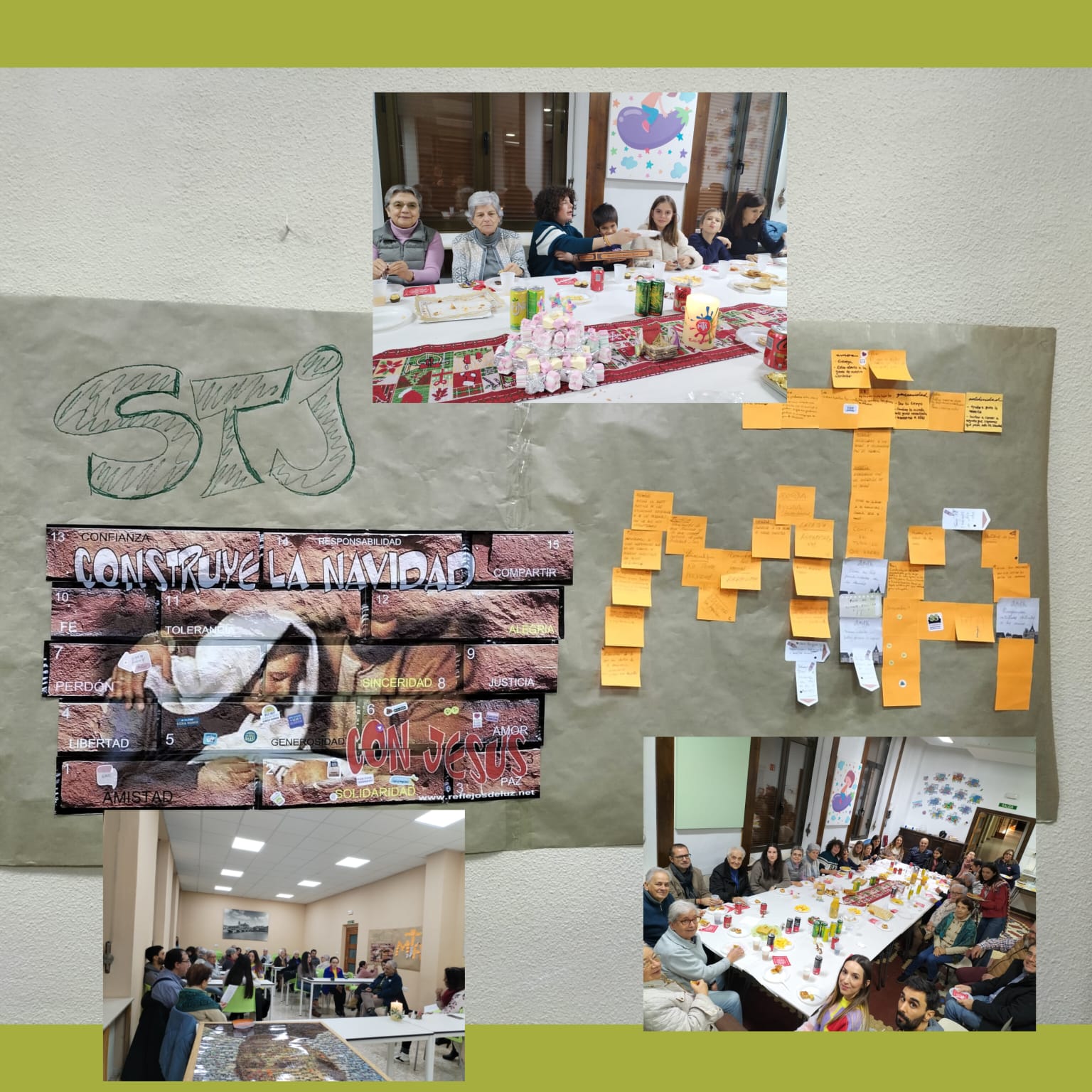 Para isso, seguimos uma dinâmica construindo um muro com tijolos imaginários onde se refletiam diferentes palavras como: amizade, perdão, fé, partilha… Dividimo-nos em grupos e a cada grupo foram distribuídos alguns tijolos; foi feita uma reflexão sobre o como pessoalmente e em grupo com palavras, frases, gestos… poderiam formar uma parede sólida para poder construir o Natal com Jesus.