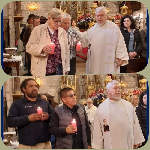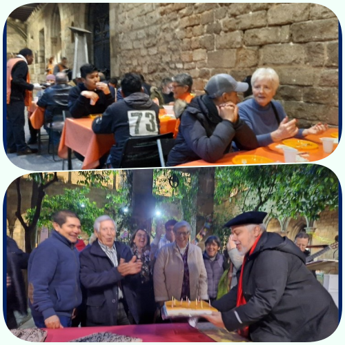 Mas também tinha sido escolhido esse dia para celebrar, como fazemos todos os meses, os aniversários daqueles que o cumprem nele, tanto voluntários como acolhidos. Nós éramos cerca de vinte. Eles repartiram os bolos com velas entre todos e se alegrou imensamente com cantos e fraternidade. Aquele claustro gótico do século XV já não vê monges passeando em silêncio, mas a alegria da fraternidade torna-o tão sagrado como o silêncio orante dos monges.
